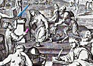 Oben der Himmlische Sklavenmarkt und unten der irdische Sklavenmarkt. Sie sind verbunden durch Fernrohr des Astrologen und durch Satyre. Außerdem durch nackte Tanzende und singende Frauen, und auf Erden. Im Himmel überreichen Satyre angezogene Frauen. die sitzen links oben auf dem himmlischen Sklavenmarkt, möglicherweise auch von einem Satyr bewacht. Sie warten auf das jüngste Gericht, bei dem Gott seine Sklaven aussucht, die ihm auf ewig dienen dürfen. Ihn zum Beisspiel zusammen mit den Engeln in englischen Chören loben und preisen. Was müssen wir sagen, um bei den englischen Chören mitzusingen zu dürfen.